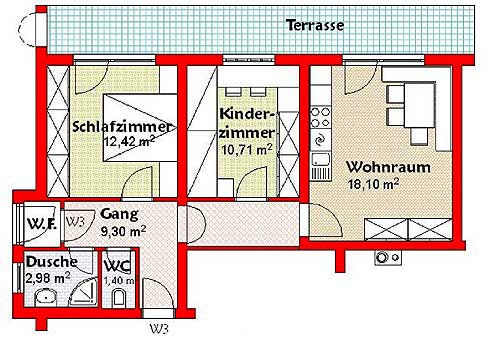 W skład mieszkania wchodzi sypialnia z łóżkiem małżeńskim, a także pokój gościnny z Sat-TV i rozkładaną jednoosobową kanapą. Pokój gościnny połączony jest z w pełni wyposażonym aneksem kuchennym (patrz tabela). W dalszej części mieści się łazienka z natryskiem i oddzielna toaleta.